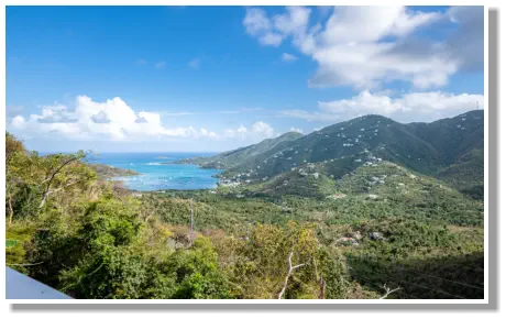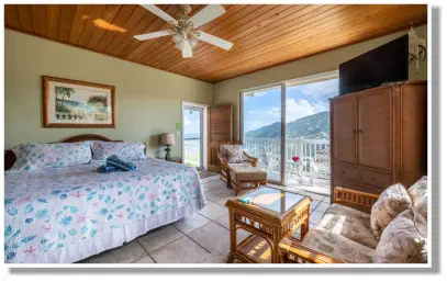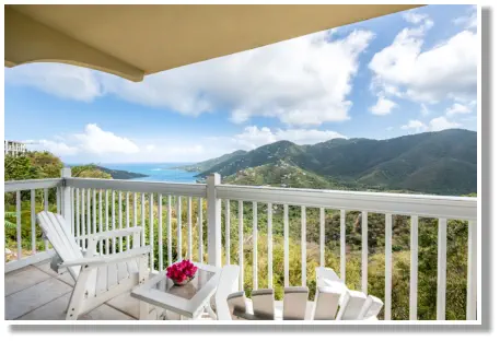 in the sitting area on the comfortable rattan furniture, you will enjoy the views of Coral Bay and the Bordeaux Mountains.