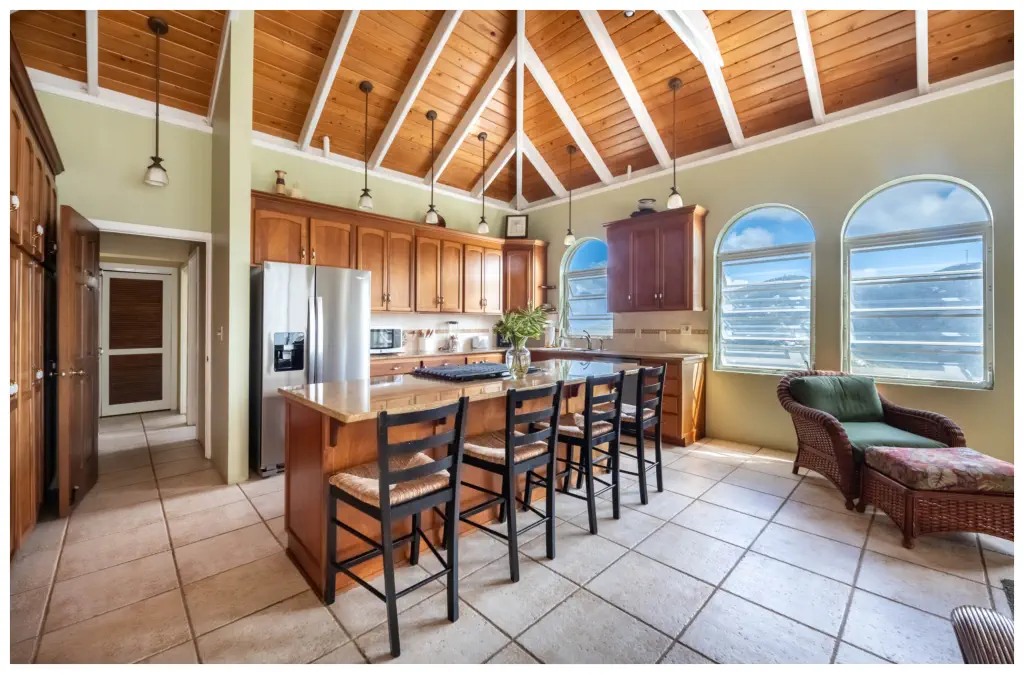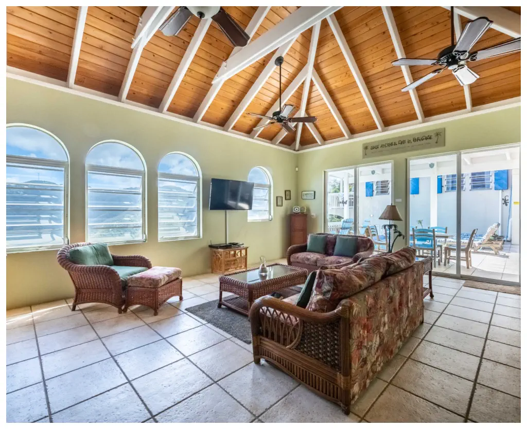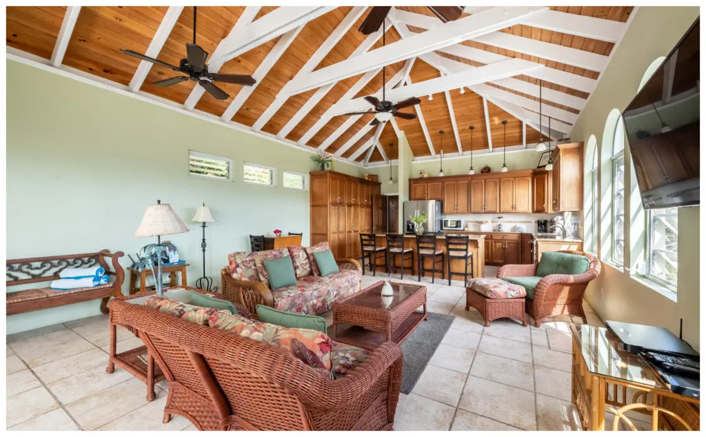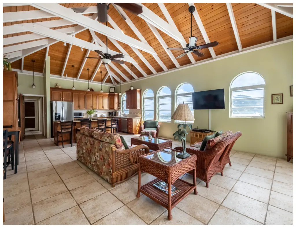 The Great Room features soaring ceilings with beautiful clear Cypress and imported Italian tile floors. The furniture is tropical
